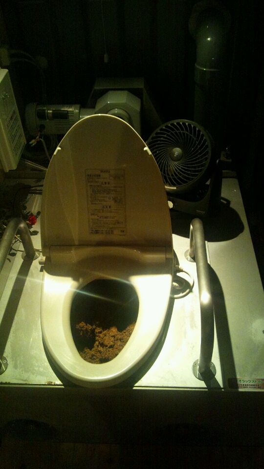 「流す」押したら中の土がぐるぐる回るんですが、これがなかなか便座に近くて怖い。